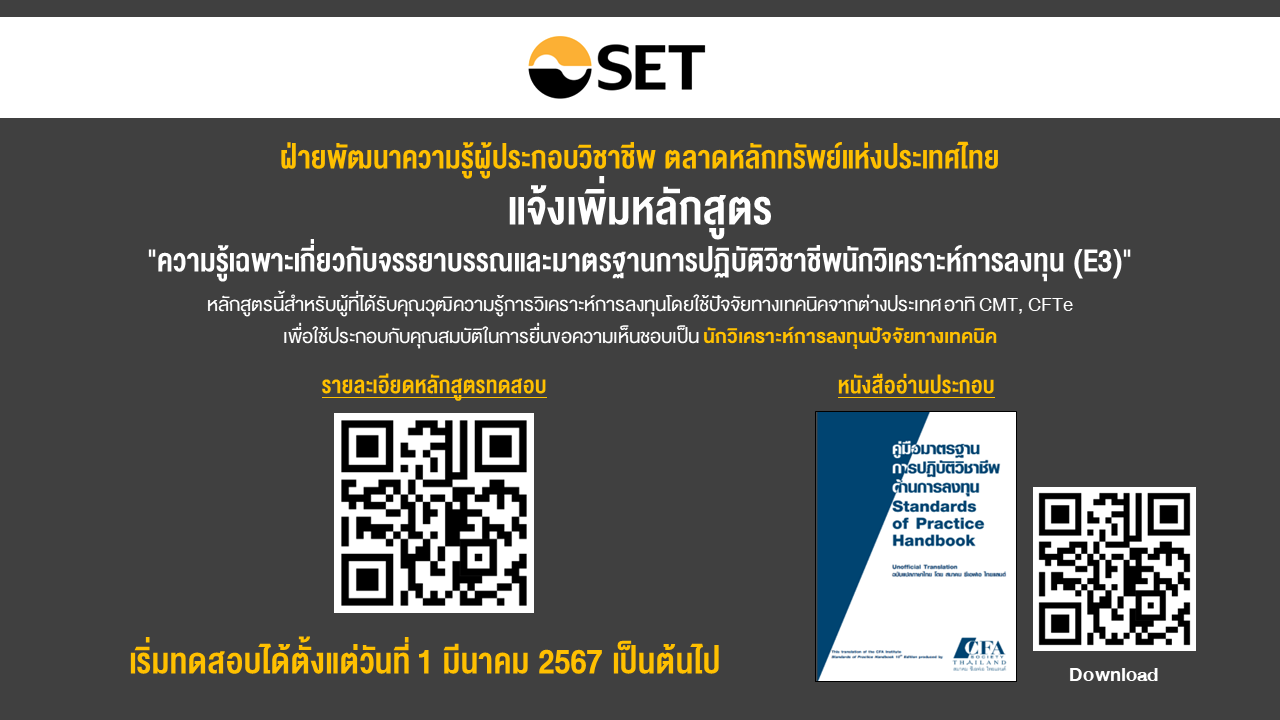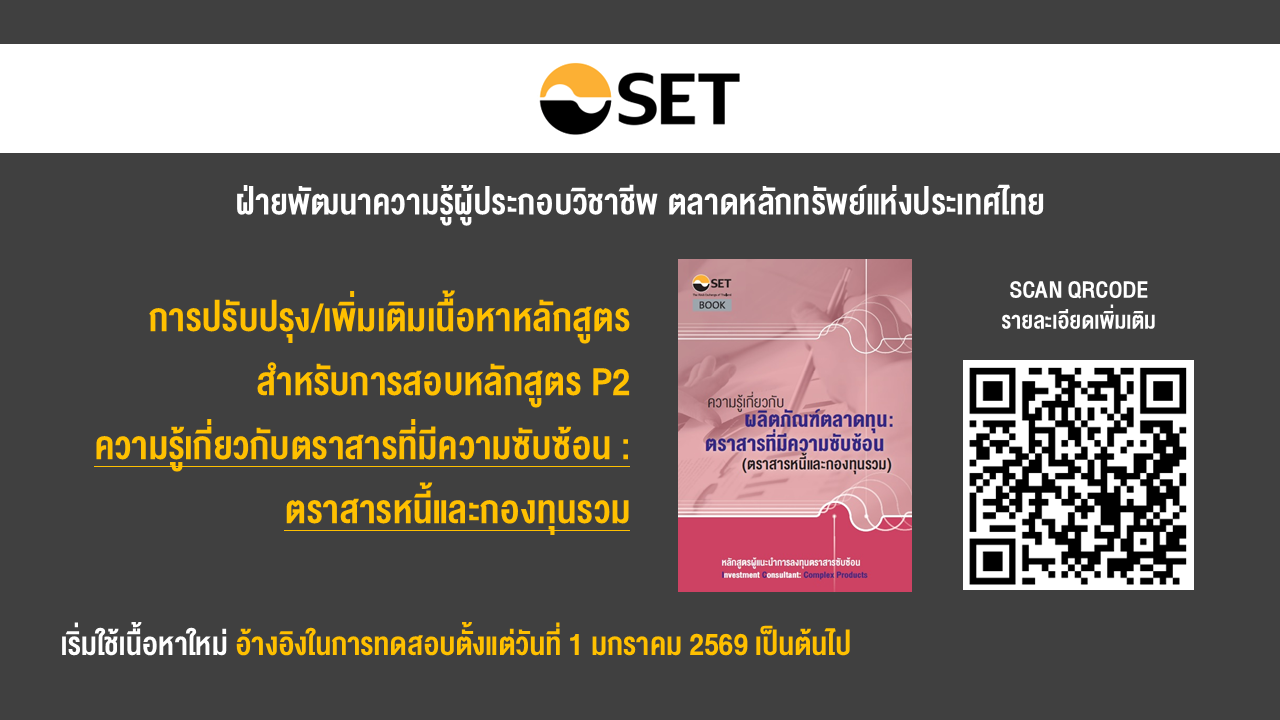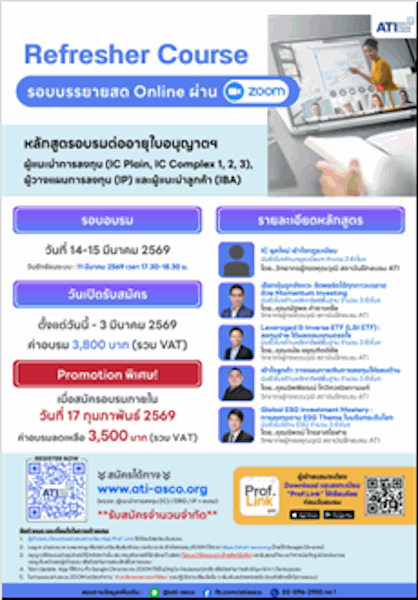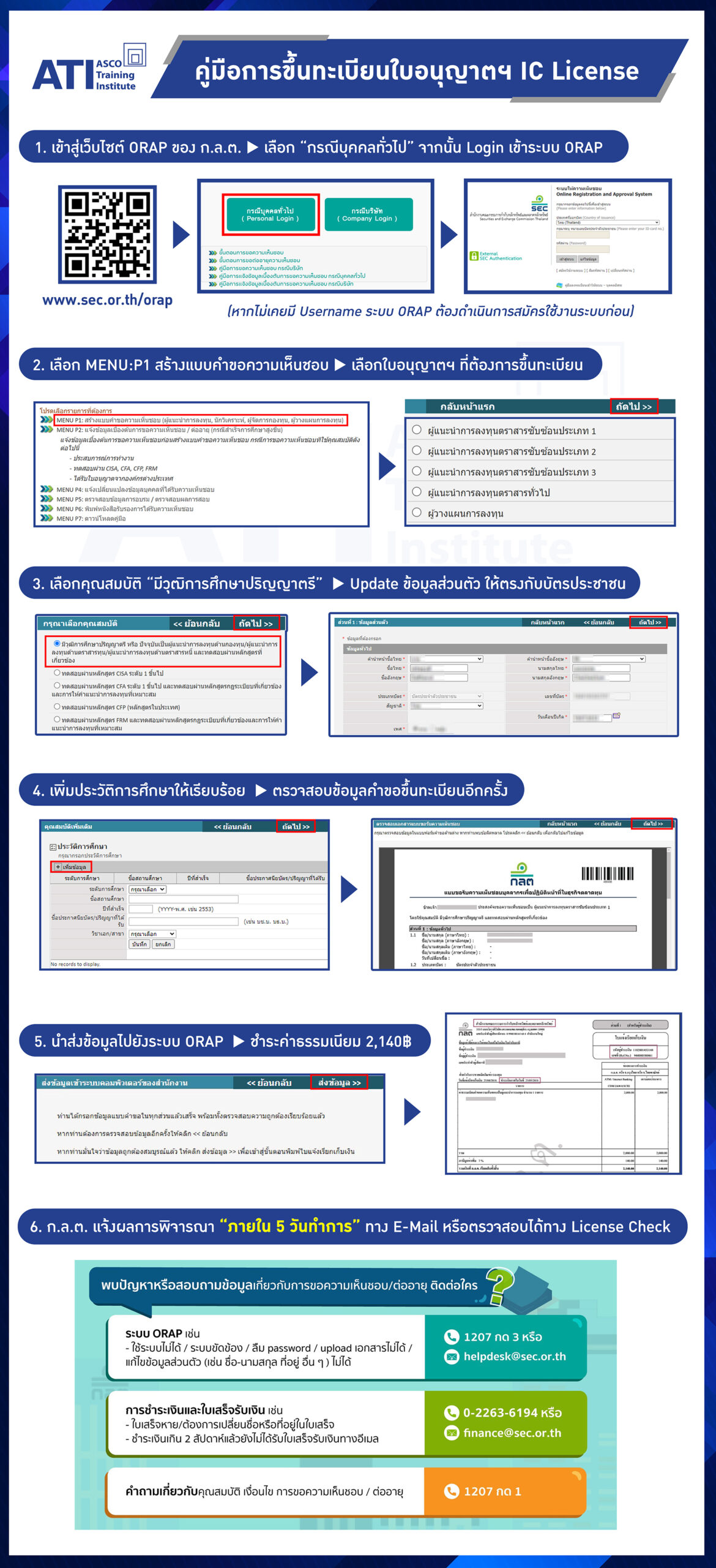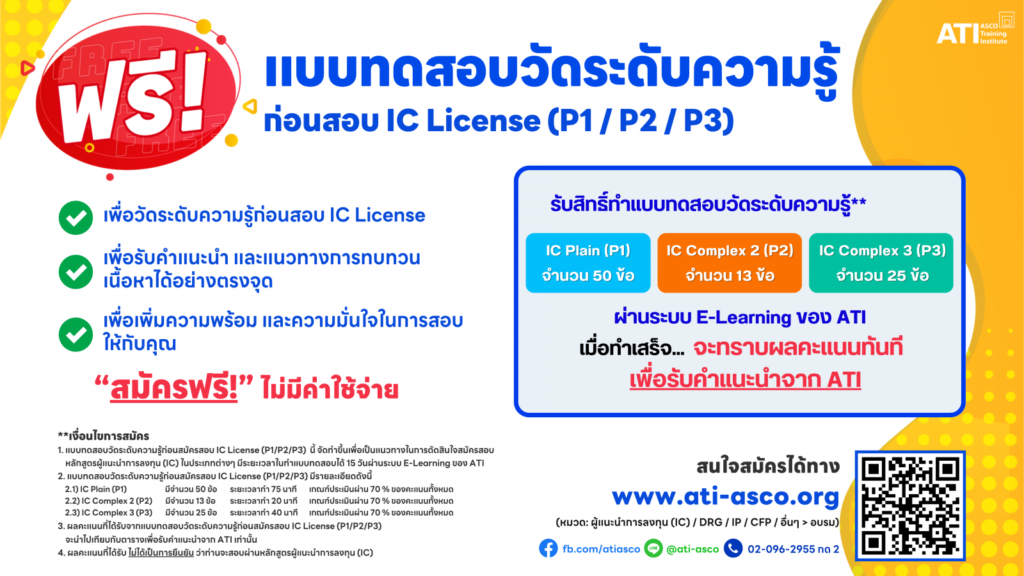 - แบบทดสอบวัดระดับความรู้ก่อนสมัครสอบ IC License (P1/P2/P3) นี้ จัดทำขึ้นเพื่อเป็นแนวทางในการตัดสินใจสมัครสอบ หลักสูตรผู้แนะนำการลงทุน (IC) ในประเภทต่างๆ มีระยะเวลาในทำแบบทดสอบได้ 15 วันผ่านระบบ E-Learning ของ ATI