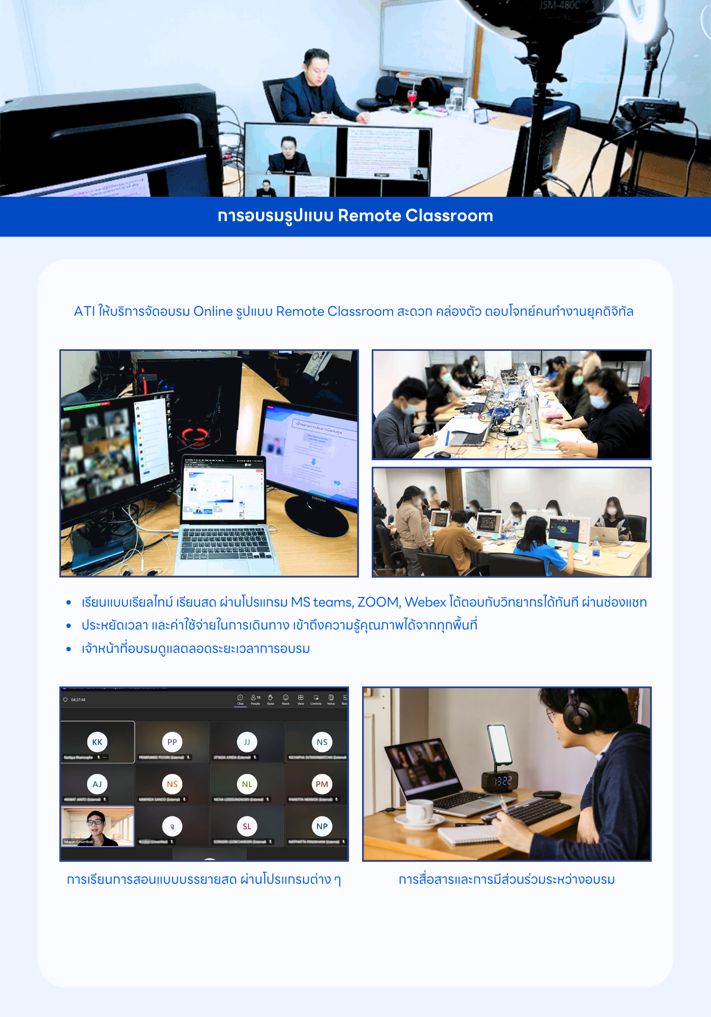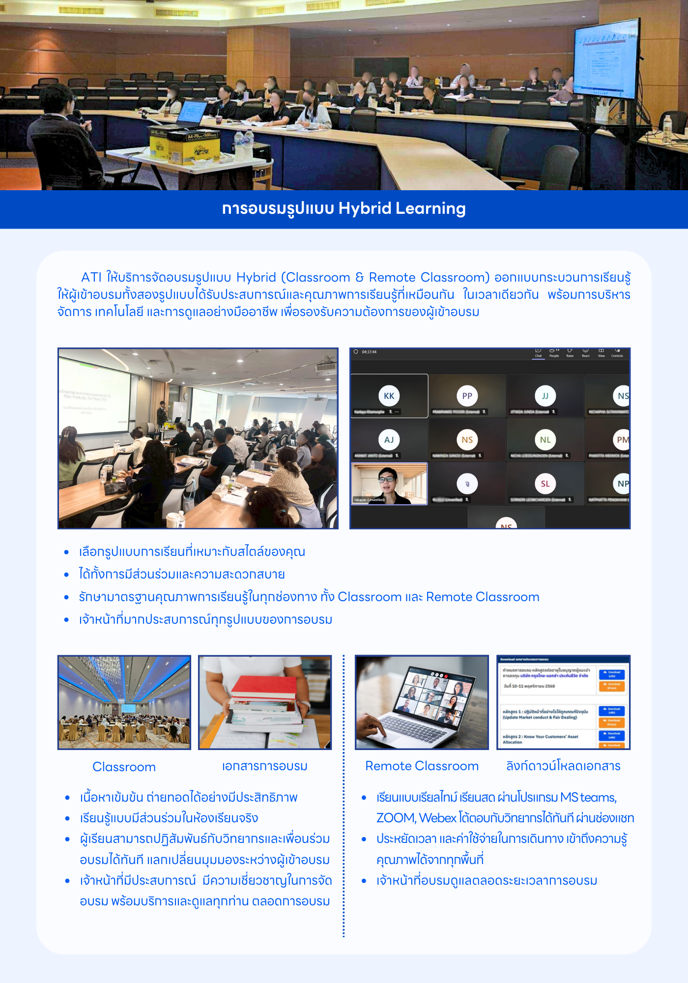 ATI ให้บริการฝึกอบรมในรูปแบบที่ยืดหยุ่นและตอบโจทย์ผู้เรียน ไม่ว่าจะเป็นการอบรมแบบบรรยายสด (Onsite) การอบรมออนไลน์ (Remote Classroom) การอบรมรูปแบบ e-Learning และรูปแบบไฮบริดที่ผสานคุณภาพการเรียนรู้เข้ากับความสะดวกในการเข้าถึง ผู้เรียนสามารถเรียนรู้จากวิทยากรผู้เชี่ยวชาญ พร้อมเอกสารประกอบที่ครบถ้วน และมาตรฐานการให้บริการในระดับมืออาชีพ ด้วยความพร้อมดังกล่าว ATI จึงเป็นทางเลือกที่เหมาะสมสำหรับผู้ประกอบวิชาชีพในตลาดทุน นักลงทุน และบุคลากรที่ต้องการพัฒนาศักยภาพของตนเอง เพื่อเติบโตอย่างมั่นคงและยั่งยืนในอุตสาหกรรมตลาดทุนไทย