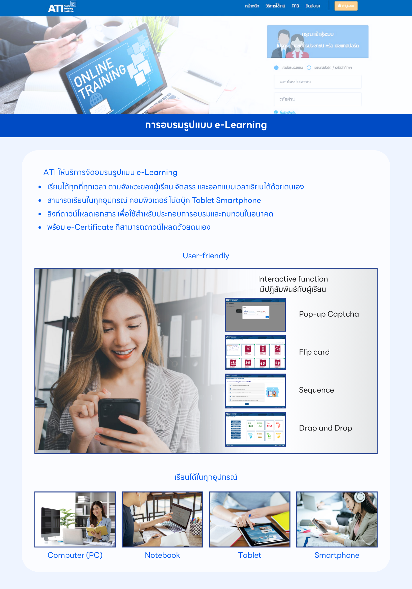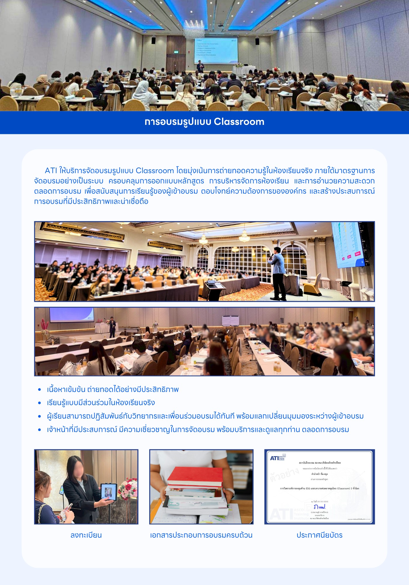ATI ให้บริการฝึกอบรมในรูปแบบที่ยืดหยุ่นและตอบโจทย์ผู้เรียน ไม่ว่าจะเป็นการอบรมแบบบรรยายสด (Onsite) การอบรมออนไลน์ (Remote Classroom) การอบรมรูปแบบ e-Learning และรูปแบบไฮบริดที่ผสานคุณภาพการเรียนรู้เข้ากับความสะดวกในการเข้าถึง ผู้เรียนสามารถเรียนรู้จากวิทยากรผู้เชี่ยวชาญ พร้อมเอกสารประกอบที่ครบถ้วน และมาตรฐานการให้บริการในระดับมืออาชีพ ด้วยความพร้อมดังกล่าว ATI จึงเป็นทางเลือกที่เหมาะสมสำหรับผู้ประกอบวิชาชีพในตลาดทุน นักลงทุน และบุคลากรที่ต้องการพัฒนาศักยภาพของตนเอง เพื่อเติบโตอย่างมั่นคงและยั่งยืนในอุตสาหกรรมตลาดทุนไทย