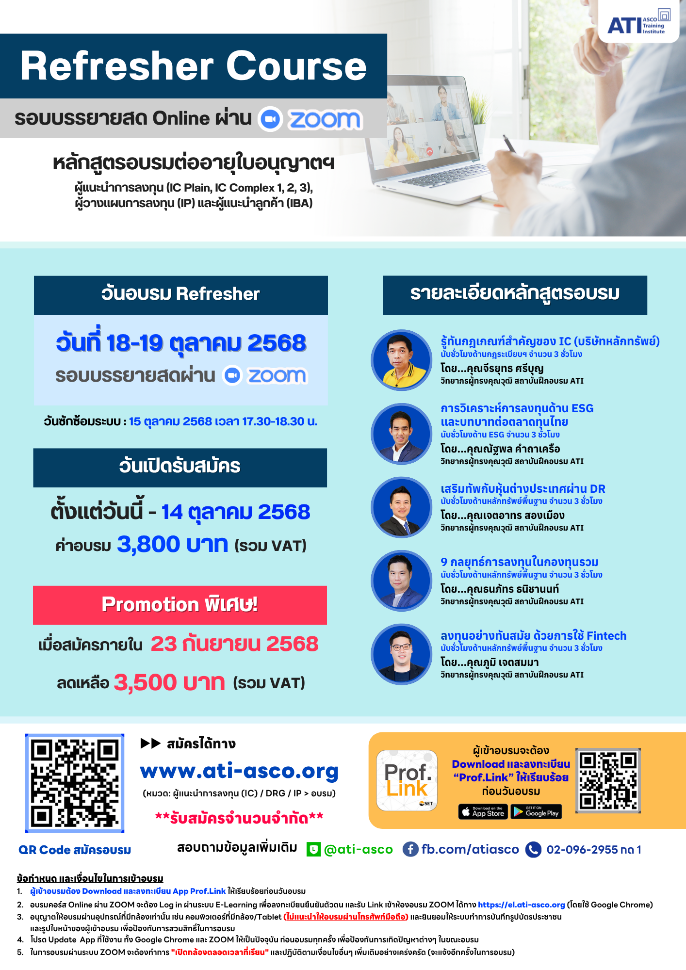ATI เปิดรับสมัครคอร์ส หลักสูตรต่ออายุใบอนุญาตฯ (Refresher Course) จำนวน 15 ชม. อบรมผ่านระบบ Online (ZOOM) วันที่ 18-19 ตุลาคม 2568